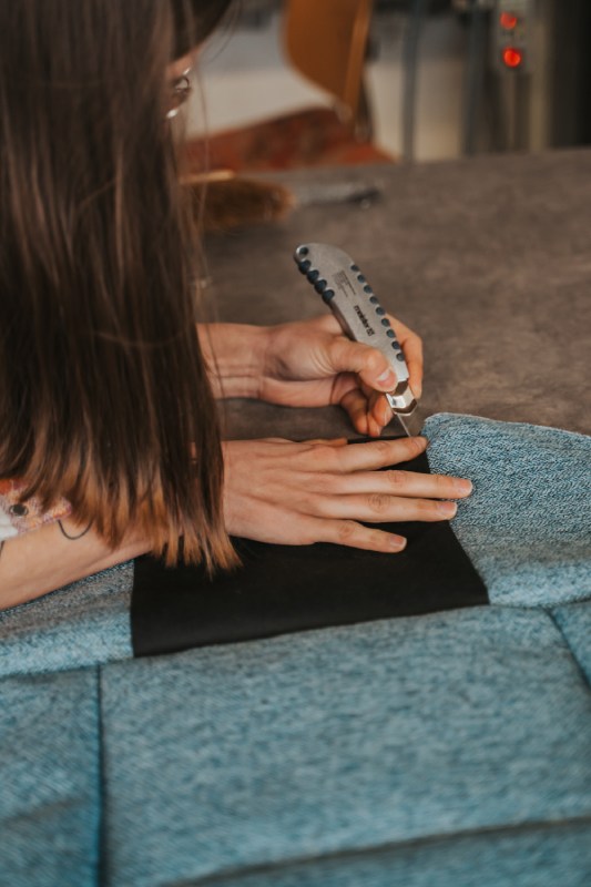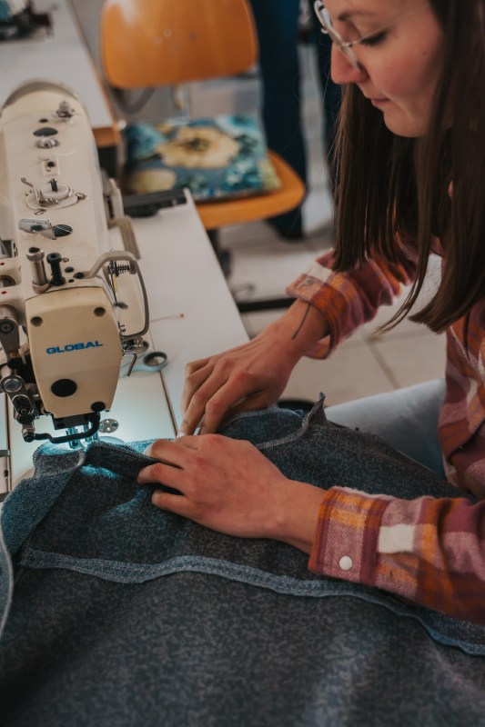 Fotografin in lässigem Denim-Outfit sitzt entspannt auf einem Sitzkissen vor einer weißen Wand.
